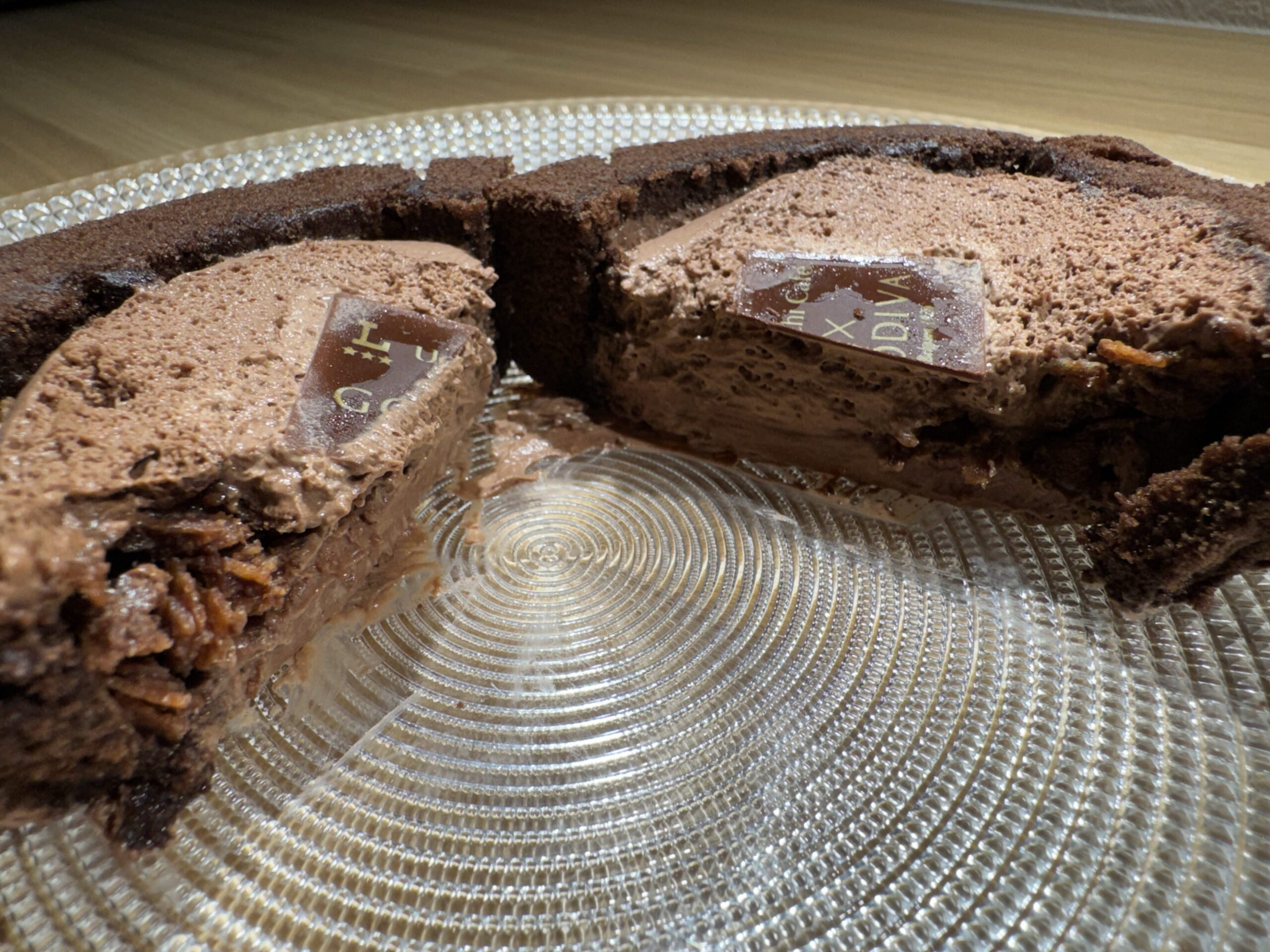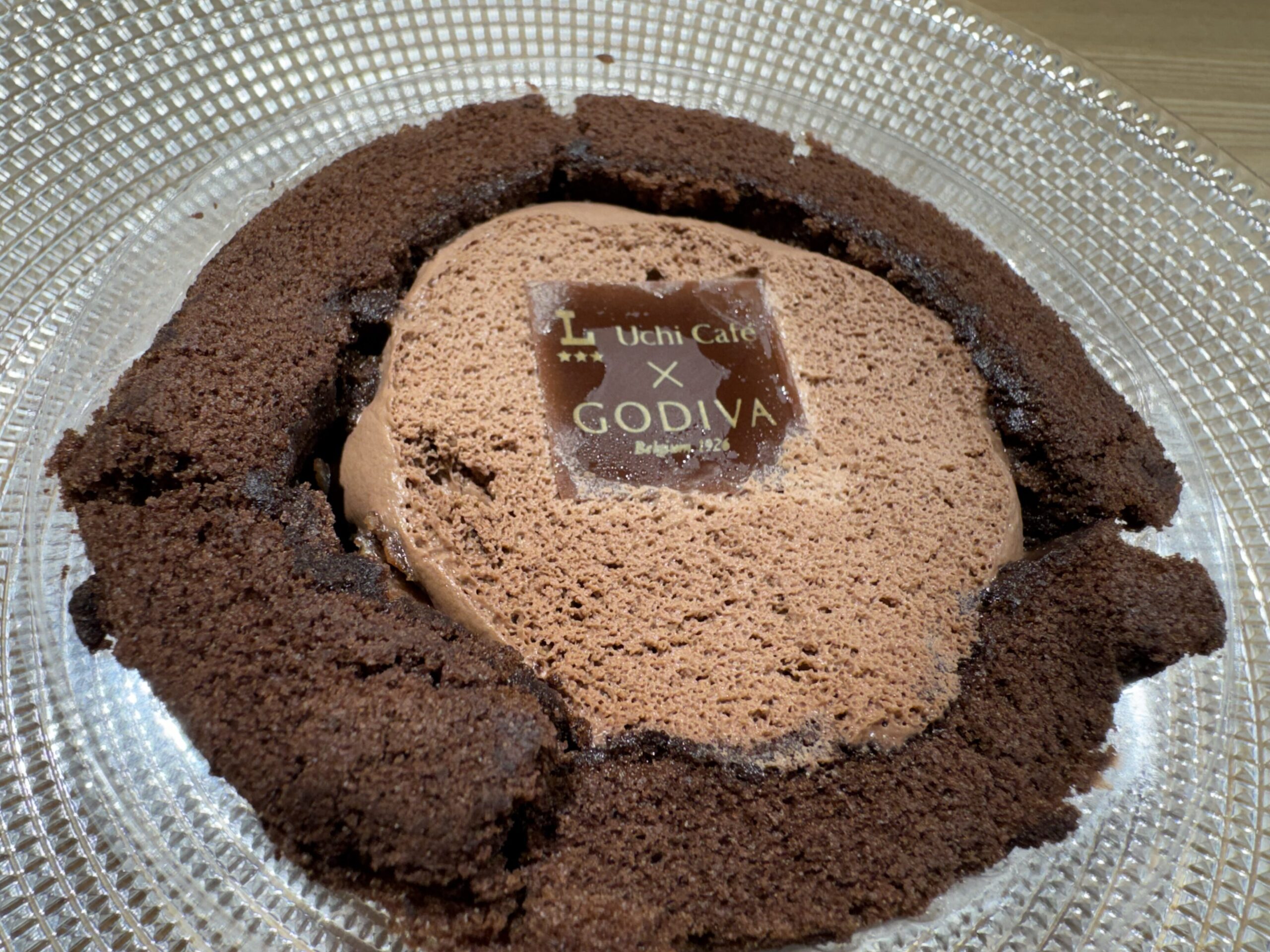 - 天面には「Uchi Café × GODIVA」のロゴがプリントされたプレートが乗り、高級感を演出しています。