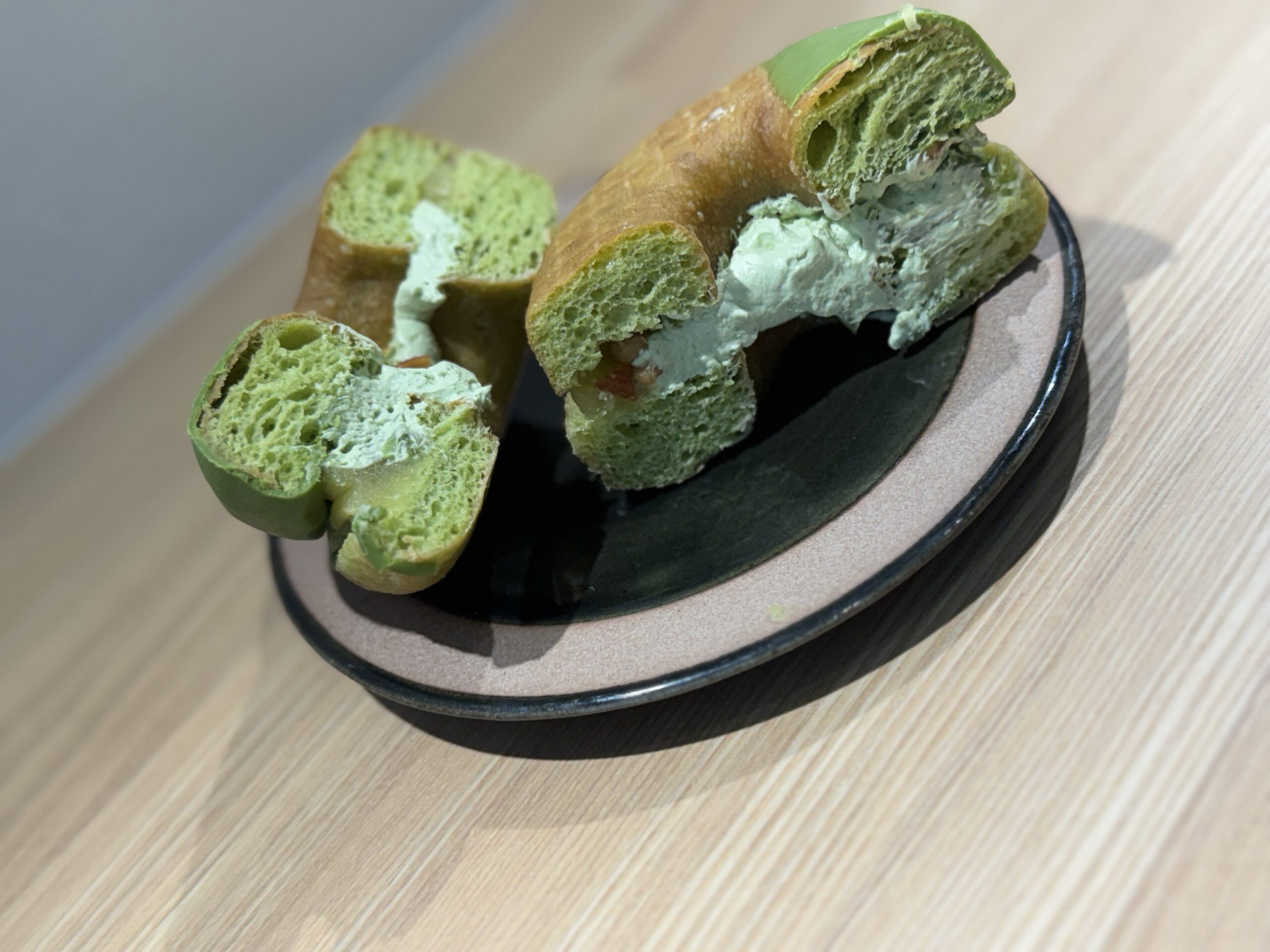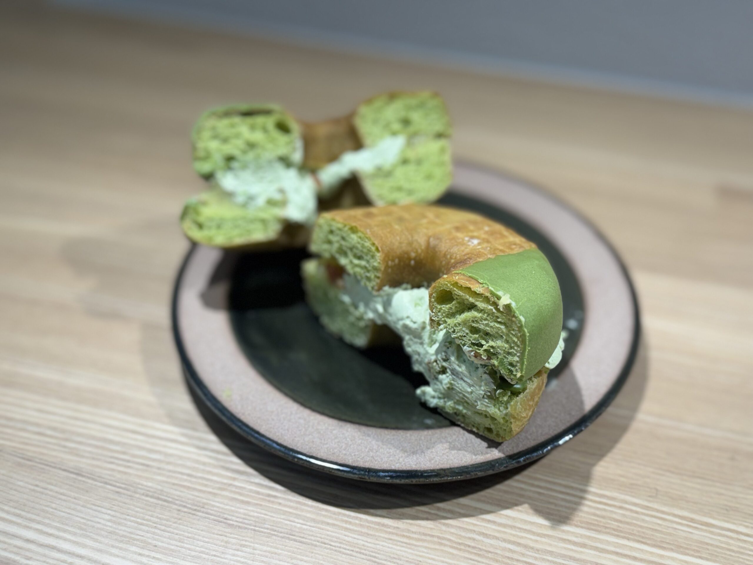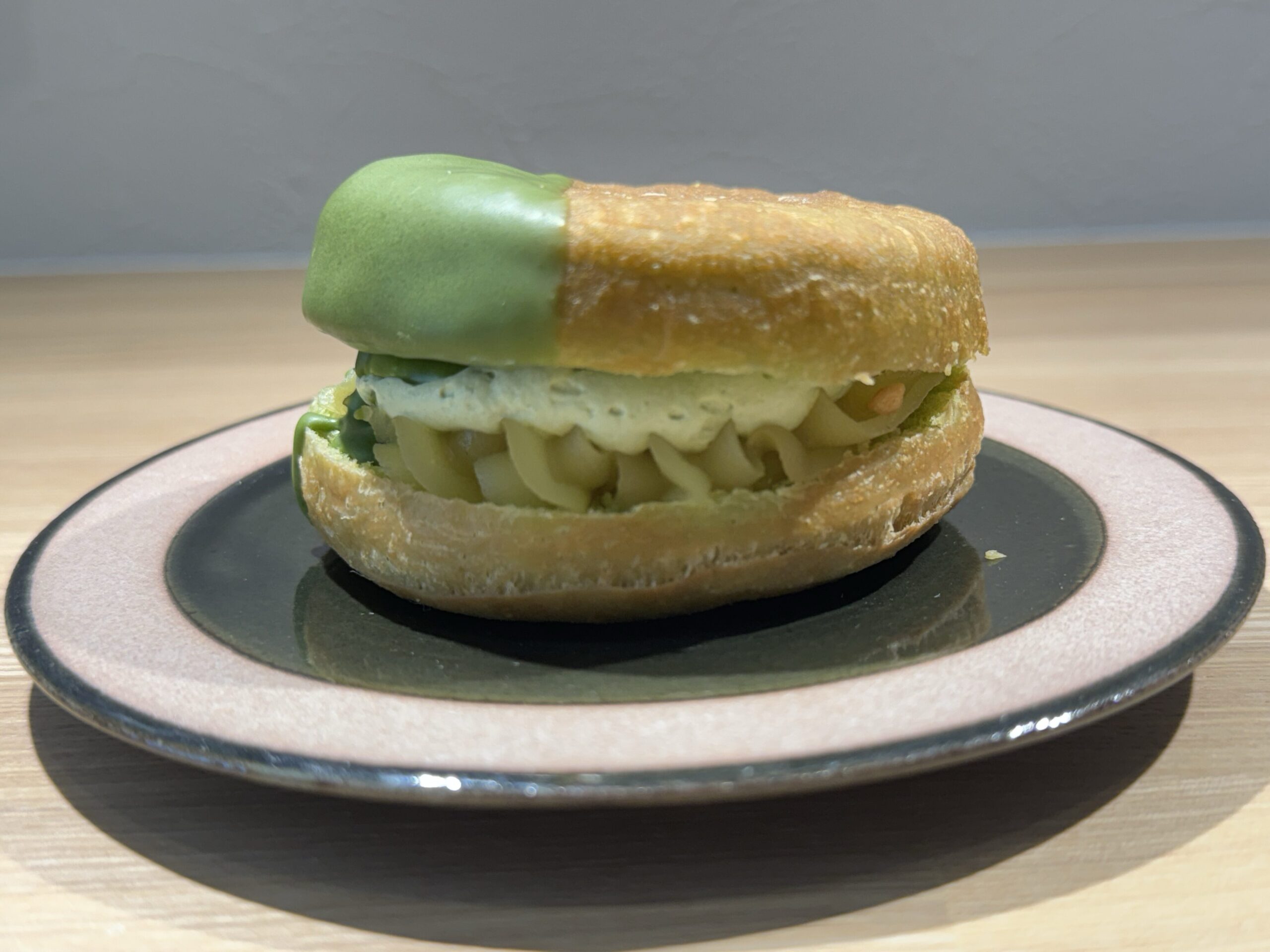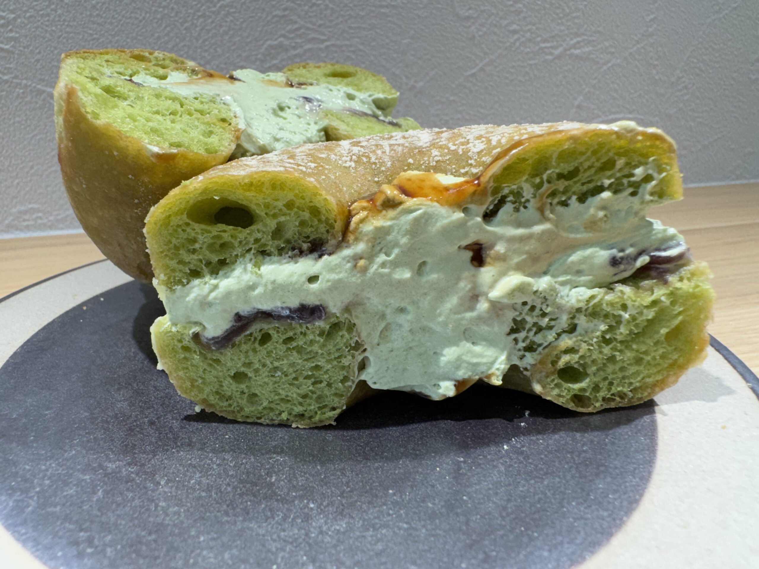 • 斜め40度(断面・ボリューム重視): 「ドら抹茶」はサンドされているホイップの厚みが魅力。      横から少し斜めに撮ることで、中の抹茶ホイップの「ふわむち感」が伝わる。