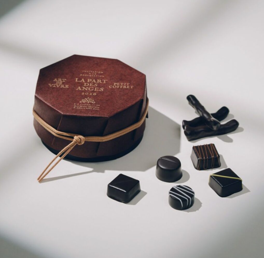 マール・ド・シャンパーニュを練り込んだビターチョコに、甘酸っぱい有機イチゴのアクセント。